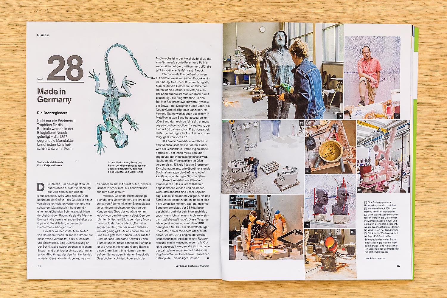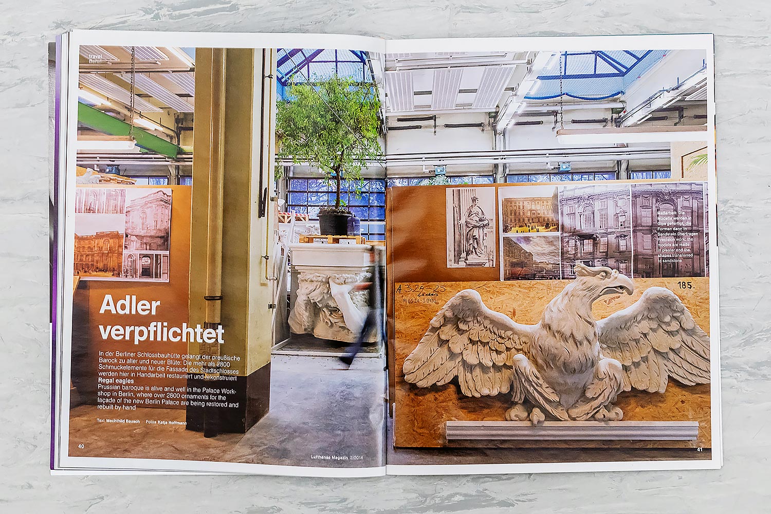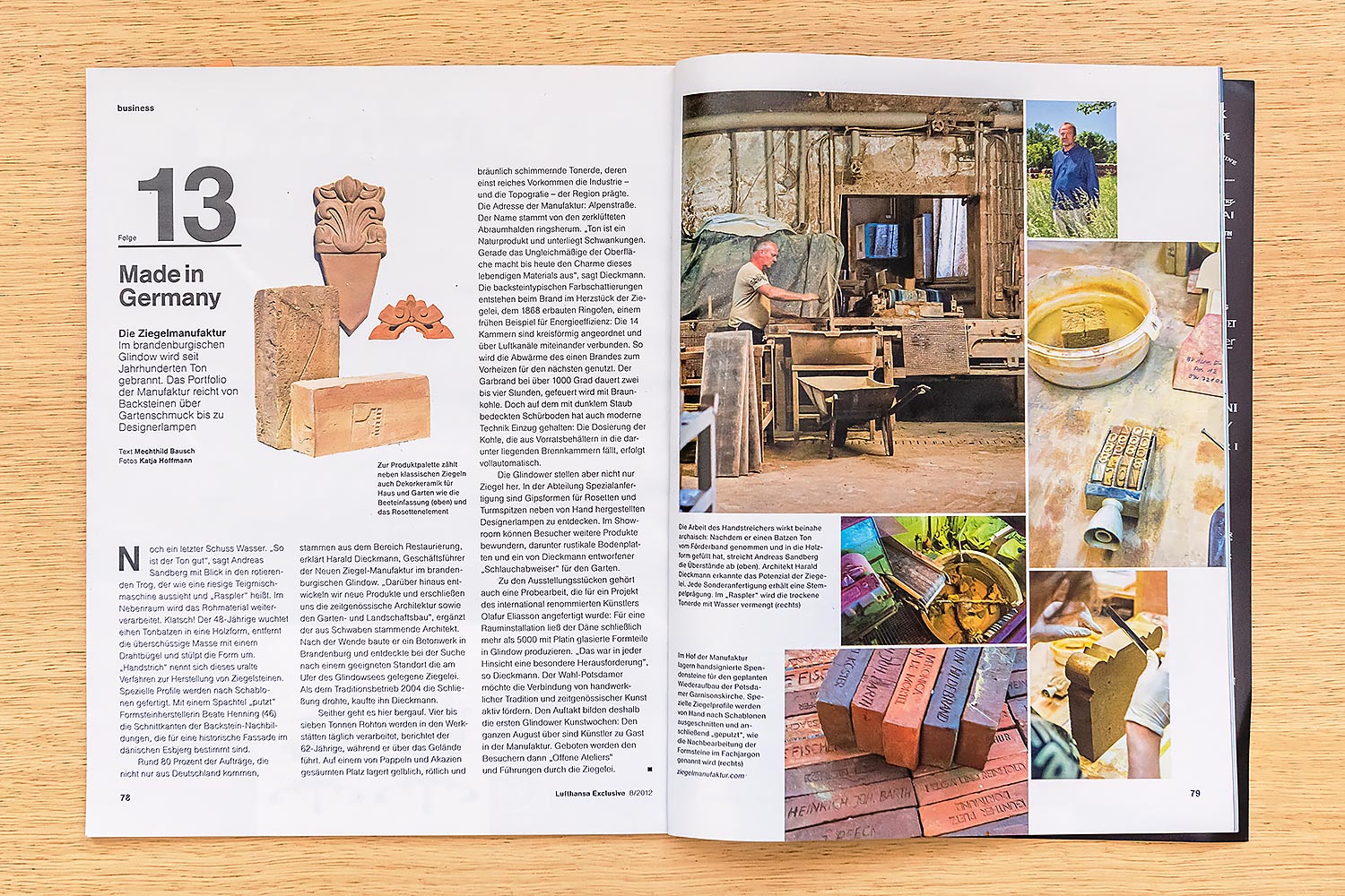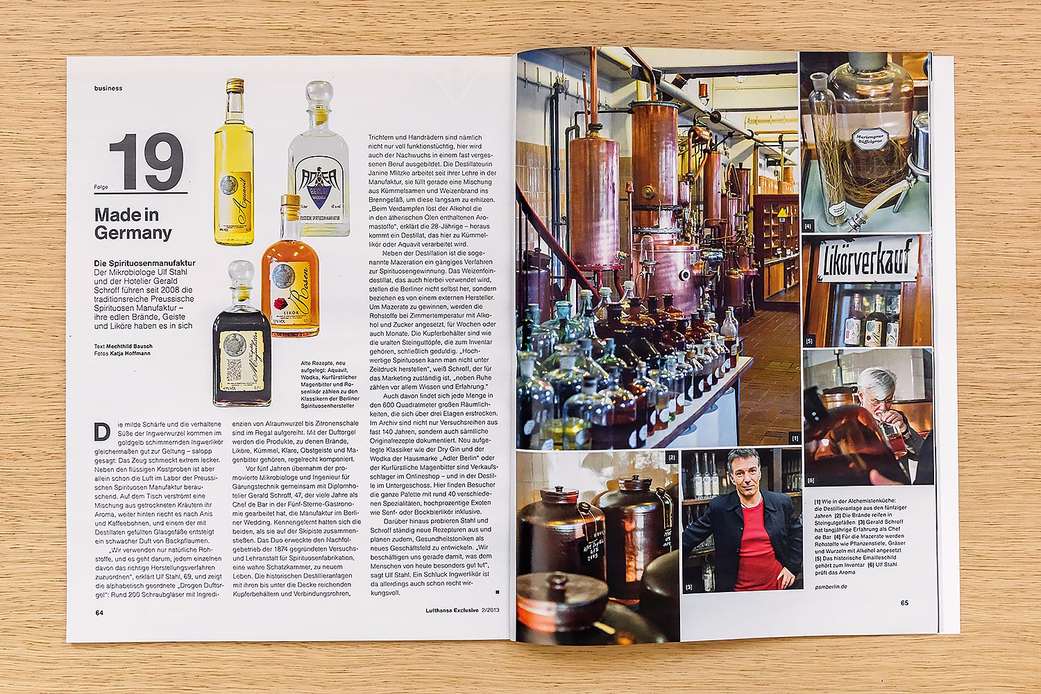 Victory Boards, Lufthansa Exclusive Nr 05, 2014 / Restaurant Nautilus, Lufthansa Exclusive Nr 05, 2014 / „Adler verpflichtet“, Berliner Schlossbauhütte, Lufthansamagazin Nr 02, 2014 / KStar Setdesign, Lufthansa Exclusive Nr 01, 2014 / Bildgießerei Noack, Lufthansa Exclusive Nr 11, 2013 / Boxstall Sauerland, Lufthansa Exclusive Nr 07, 2013 / Papiermanufaktur Pappenstil, Lufthansa Exclusive Nr 04, 2013 / Preußische Spirituosenmanufaktur, Lufthansa Exclusive Nr 02, 2013 / Ziegelmanufaktur Glindow, Lufthansa Exclusive Nr 08, 2012 / „It’s Showtime“, Hugo Boss backstage Berlin Fashion Week, Lufthansa Woman’s World Nr 03, 2009