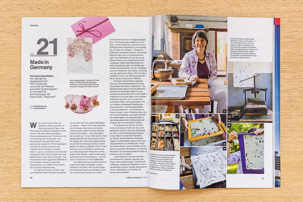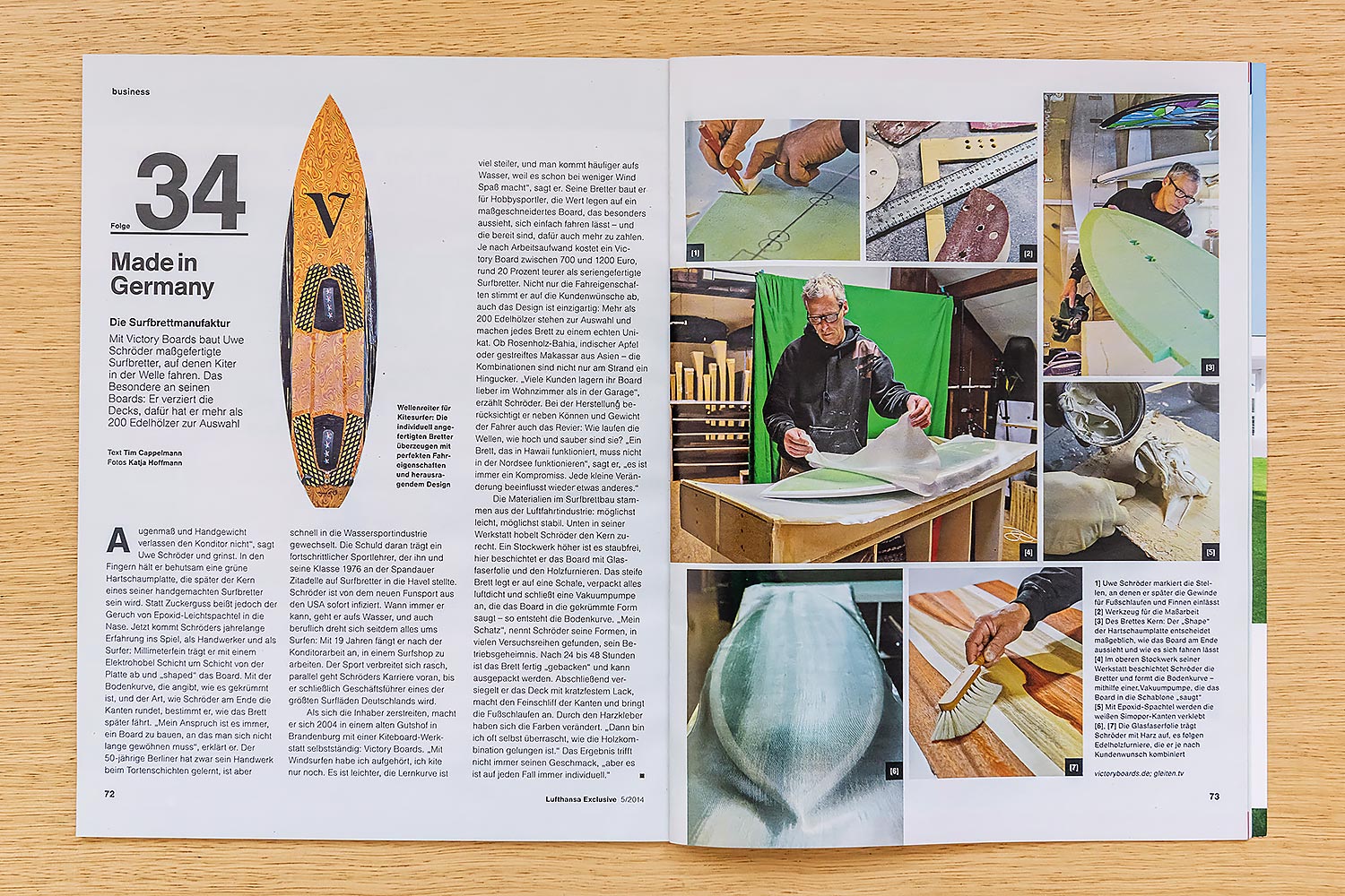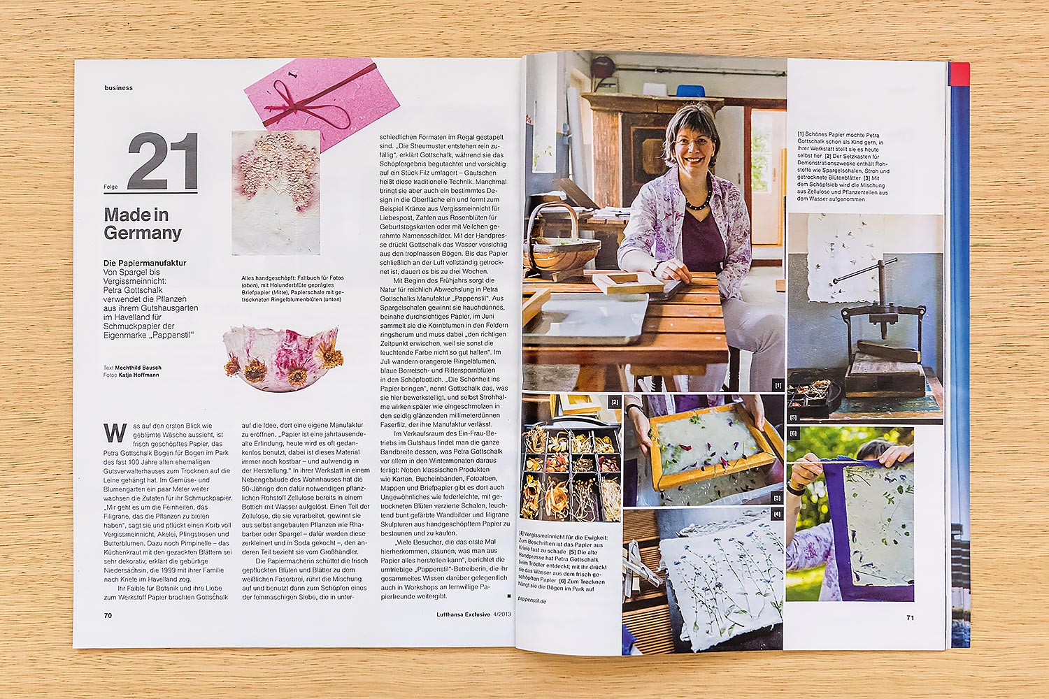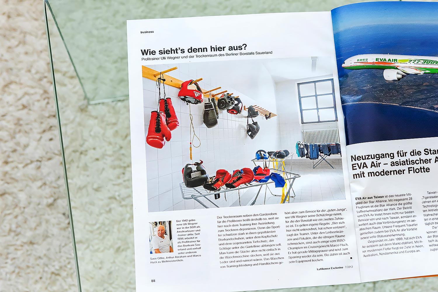 Victory Boards, Lufthansa Exclusive Nr 05, 2014 / Restaurant Nautilus, Lufthansa Exclusive Nr 05, 2014 / „Adler verpflichtet“, Berliner Schlossbauhütte, Lufthansamagazin Nr 02, 2014 / KStar Setdesign, Lufthansa Exclusive Nr 01, 2014 / Bildgießerei Noack, Lufthansa Exclusive Nr 11, 2013 / Boxstall Sauerland, Lufthansa Exclusive Nr 07, 2013 / Papiermanufaktur Pappenstil, Lufthansa Exclusive Nr 04, 2013 / Preußische Spirituosenmanufaktur, Lufthansa Exclusive Nr 02, 2013 / Ziegelmanufaktur Glindow, Lufthansa Exclusive Nr 08, 2012 / „It’s Showtime“, Hugo Boss backstage Berlin Fashion Week, Lufthansa Woman’s World Nr 03, 2009