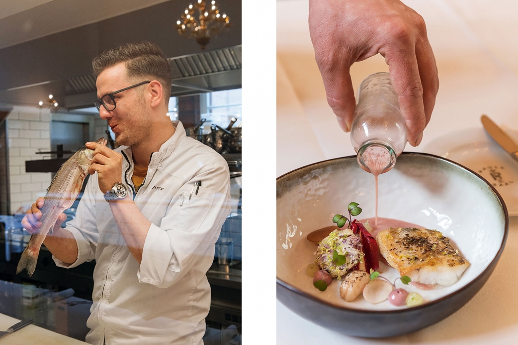 The Pauly-Saal restaurant in the former gymnasium of the Jewish girls‘ school is a new culinary highlight in the capital, named after the Pauly manufactory, which made the extraordinary Murano chandelier especially for the dining room. Arne Anker is the chef de cuisine at the gourmet restaurant in Berlin Mitte, which specializes in fish.